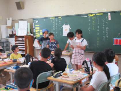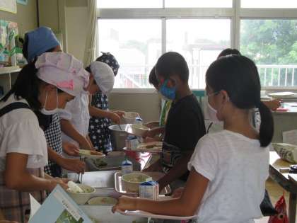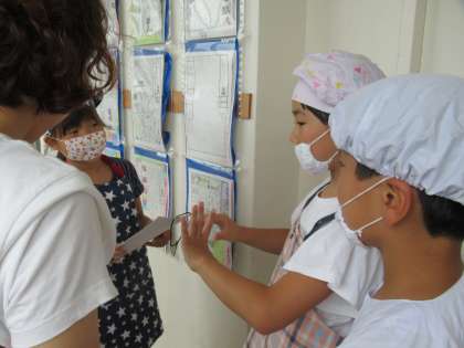 給食当番は、健康状態や身なり、手洗いなどを確認して、ワゴンを取りに行きます。