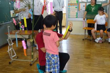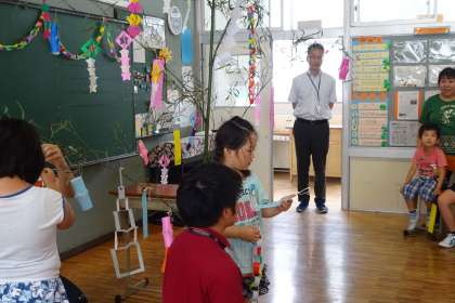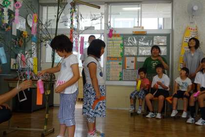 次は短冊の発表です。願いが書かれた短冊を読み上げて、大きな笹に飾りました。