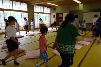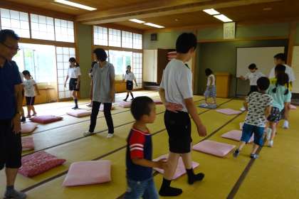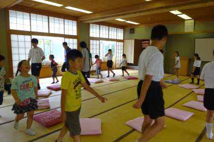 次はイス(座布団)取りゲームです。ぐるぐる回りながら、自分が座りたい座布団に狙いを定めています。
