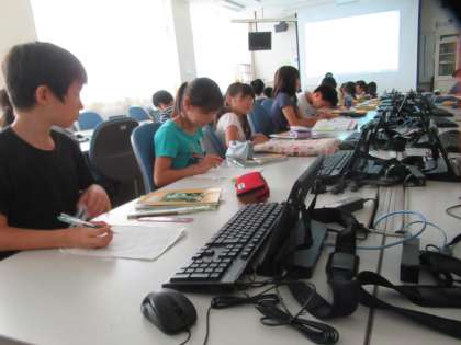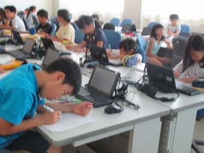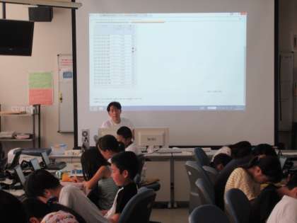 温度変化の様子を、グラフにまとめています。パソコン室で、映像を見ながらの学習です。