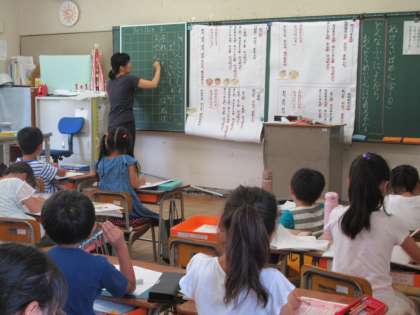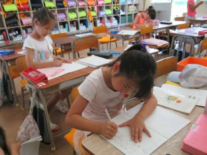 先生は、子どものノート同じます目のシートに、板書しています。それを丁寧に自分のソートに写すのも、1年生にとっては大切な学習です。