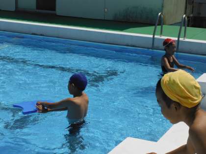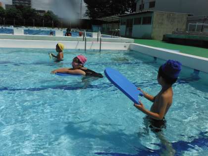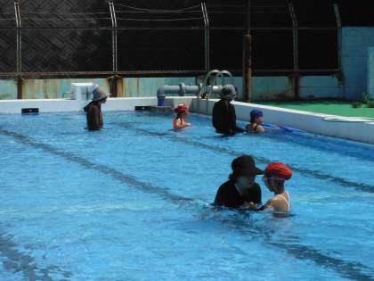 久々に入ることができたプールです。中・高学年は水泳を、低学年は水に慣れるために水遊びをしています。天候にも恵まれ、とても気持ちのよいプールになりました。