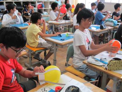 ランプシェードを作ります。今日は、風船で型を作り、その上に紙粘土をのせていきます。