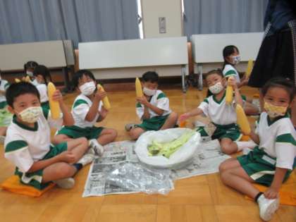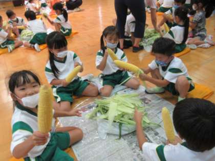 メインの活動は、トウモロコシの皮むきです。班ごとに丸くなって座り、1本1本丁寧に皮をむきました。見るだけでわからない手触りや臭いも含め、トウモロコシの瑞々しい生命力を感じながら、むきました。