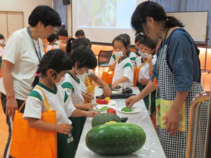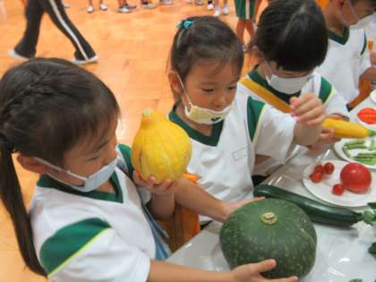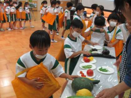 教室にもどりながら、夏野菜に触らせてもらいました。手触りや重さ、臭いも確かめました。