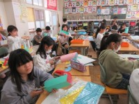 蒸し暑い教室ですが、汗をふきふき、焼き肉を頬張っています。