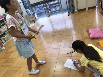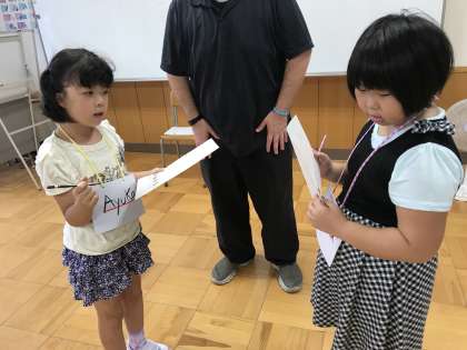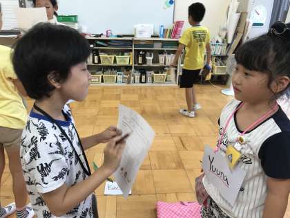 今日の5時間目は英語でした。フルーツの名前を覚えた後、それぞれの好きなフルーツについて質問しあっています。パイナップルやリンゴが人気です。