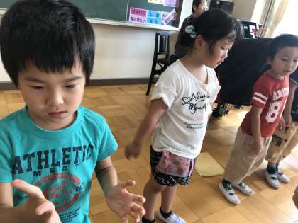 1年生が前に来て、「ふしぎなポケット」を元気に歌っています。手を使って、ビスケットの数を数えている子もいます。