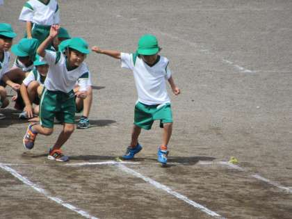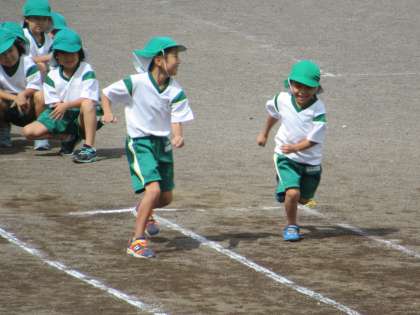 短距離走のタイムを計りました。コースをまっすぐ走るのも、1年生にとっては難しいことなんです。