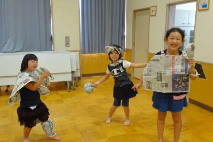 図工の時間です。新聞紙をちぎったり、丸めたりしながら思い思いに何かを作っています。こちらでは、新聞紙をやぶき、体にかけて楽しんでいます。