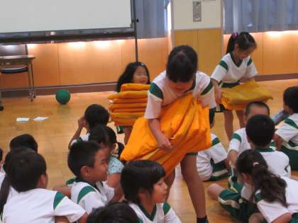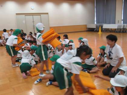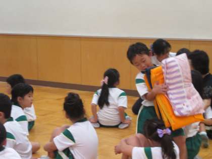 ゲームが終わり、片付けてあった防災頭巾をもとに戻します。気がついた子がどんどん分けていて、感心させられました。
