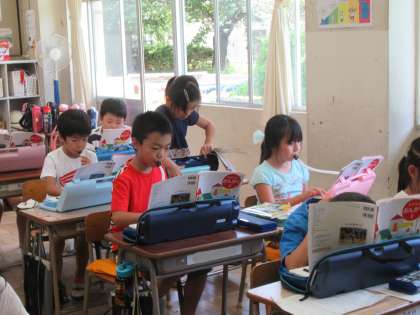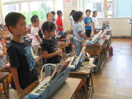1年生の4時間目は、音楽。鍵盤ハーモニカの練習をしています。
