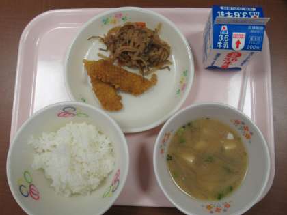 今日は、イカのさらさ揚げ、ゆで干し大根の煮物、里芋の味噌汁です。