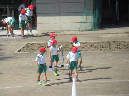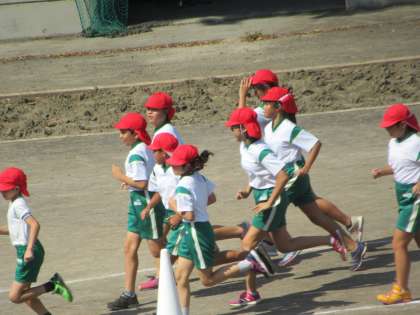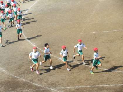 準備運動で、ランニング。今日は、ハードルにも挑戦します。