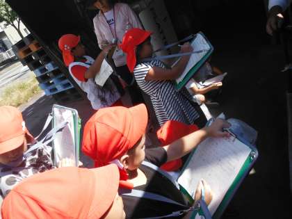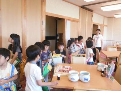 赤コースでは、かに甲羅本店さんや見須青果さんにお邪魔しました。かに甲羅さんの人気メニューや見須青果さんの果物や野菜を見せていただき、目を光らせる子どもたち。たくさんのお話を聞かせていただいて、どんなツアーにしてその魅力を紹介しようか、わくわくしているようでした。