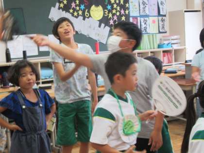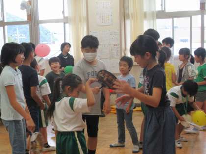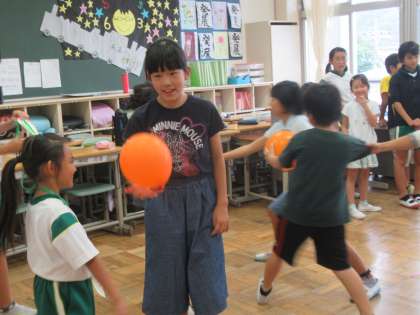 うちわを使った風船ゲーム。低学年にも簡単にできて、好評です。