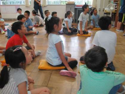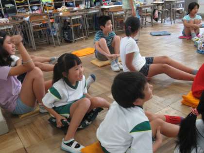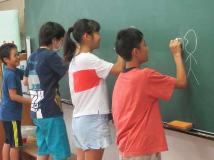 伝言ゲームは答えを絵で表現するルール。伝言の速さより絵心が問われ、描く子は苦笑い、それを見るみんなは爆笑です。