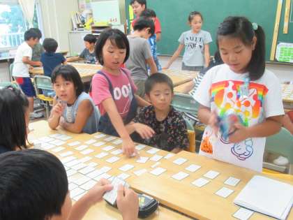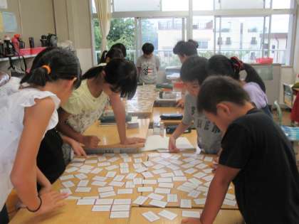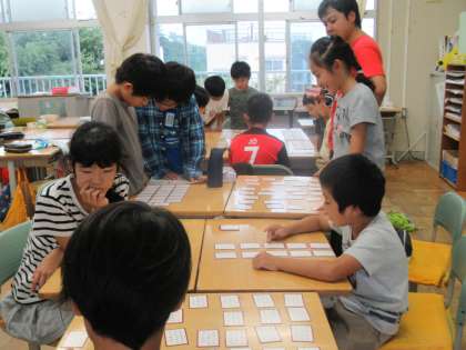 百人一首の学習です。班ごとに、取り札を確認していました。