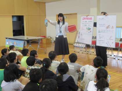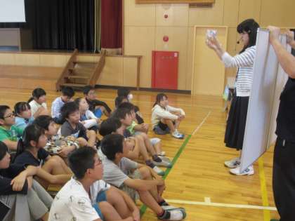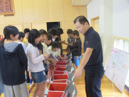 みんなで分別したゴミを、解説していただきました。即席めんの容器が、よく似ていても片方は紙製でもう片方はプラスチック製だと知って、驚きました。