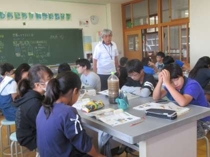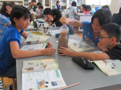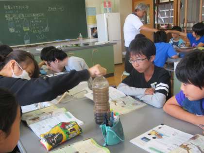 地層の学習をしています。ペットボトルでは、地層のでき方を確かめていました。