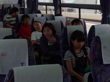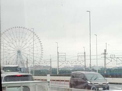 ディズニーランドの観覧車が見えてきました。興奮している子もいれば、仮眠中の子も…。