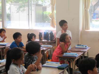 3つの数を足したり引いたりする問題に取り組みました。10人居て、6人帰って、3人来たら、何人になる?なんとなく答えは分かるけれど、順序立てて計算して、みんなに分かるように説明するのは、難しいですね。