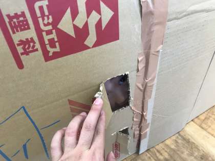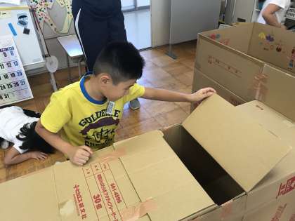 2組が作った段ボールハウスで、みんなで遊んでいます。随所に工夫が散りばめられている面白いハウスです。