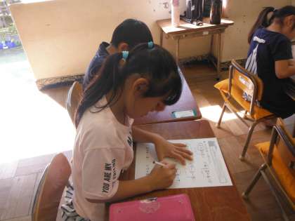 3口の計算の練習をしました。計算のやり方が分かるように、プリントの式に書き加えていました。