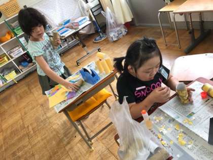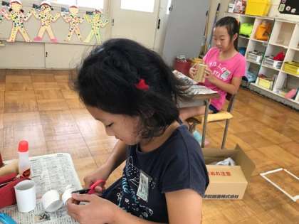 トイレットペーパーの芯を使った工作に取り組んでいます。どんなものを作ろうか、トイレットペーパーの芯をじっくり観察しながら考えています。