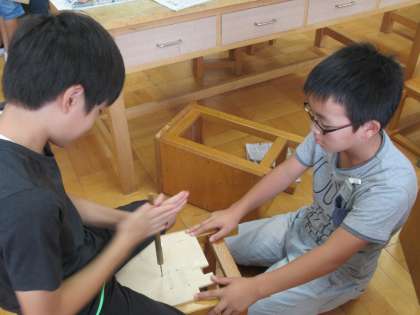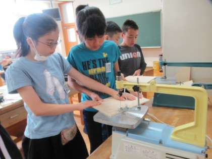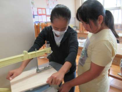 糸のこやキリを使って、工作をしています。友達と助け合って、作業を進めます。