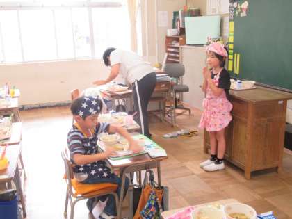 配膳がとても上手です。あいさつも、上手にできるかな。