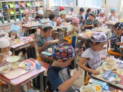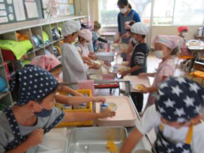 配膳がとても上手です。あいさつも、上手にできるかな。