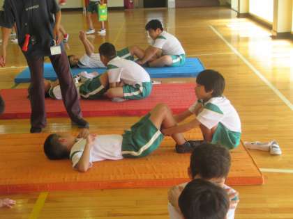 上体起こしは、友達とペアになって行います。