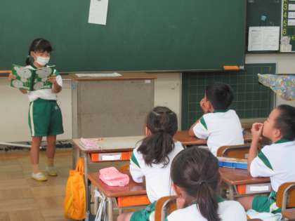 当番さんがスピーチをしました。日記帳を読んで、昨日の出来事を説明しました。