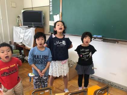 白組応援歌の練習をしています。手は後ろに組んで、大きな声を出します。初めて参加する子達も頑張っていました。張り切り過ぎて、終わった瞬間に「はぁ〜疲れた!」と言っていた子もいました。
