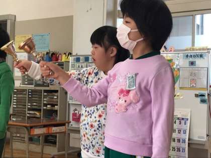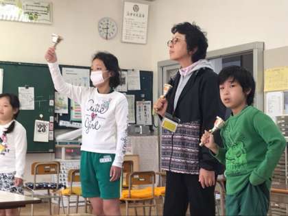 ハンドベルの特訓中です。指揮者をよく見て演奏することを心がけています。