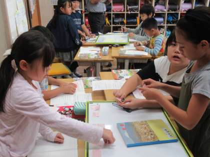 コンビニとスーパーを比べています。班ごとに考えを整理することができました。