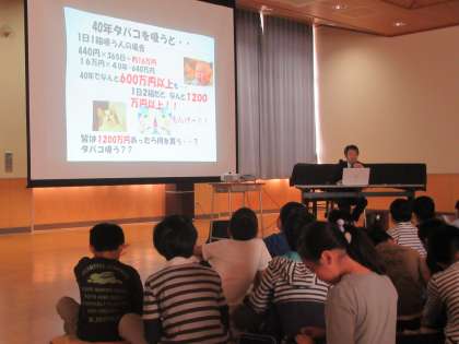 たばこについては、成長や健康への悪影響だけでなく、経済的な問題にも触れてくださいました。子どもたちは真剣な表情で聴き入り、メモを取っていました。