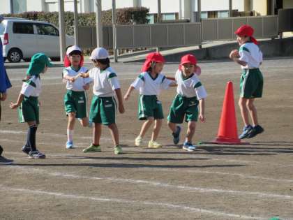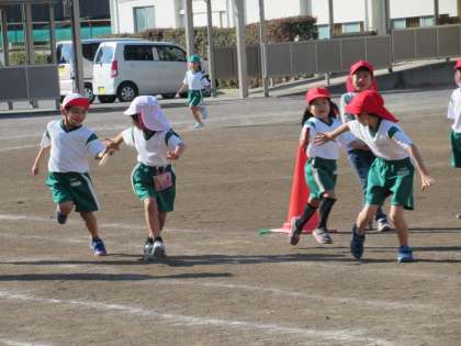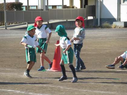 学級対抗リレーをしています。友達に声援を送る賑やかな声が、校庭にこだまします。