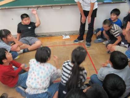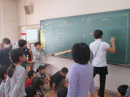 1平方メートルを学習しています。1平方センチメートルいくつ分であらわしたり、何人が入れるかを確かめたりしました。