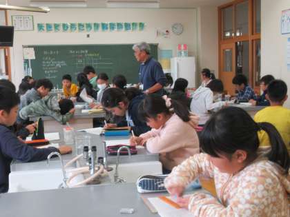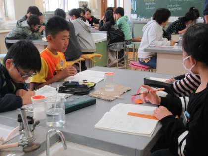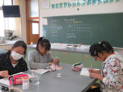 物の溶け方の学習です。一定量の水に食塩を溶かす実験をしていました。