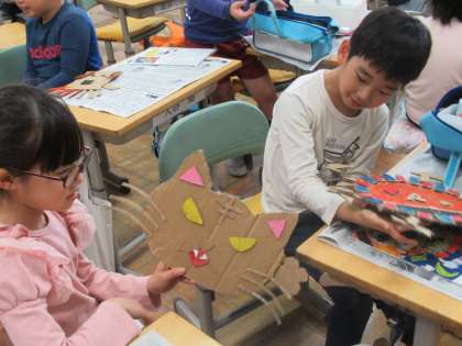ボール紙で、お面を作っています。まずは形を組み立てて、イメージした色を着けていきます。