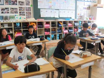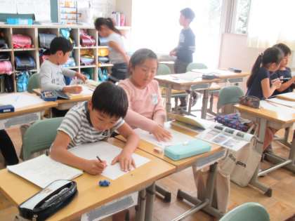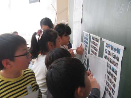 みかん選果場と干物工場の見学を通して学んだことを、新聞にまとめています。先生が撮ってくれた写真も使って、分かりやすくまとめます。