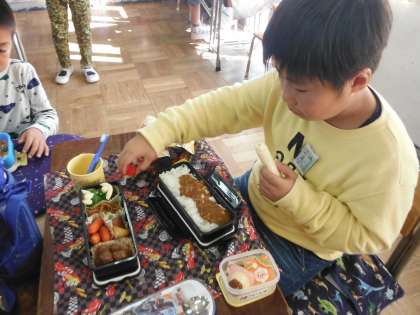 2年生は、お弁当の日です。みんなうれしそうに食べています。カレーやシチューもありました。
