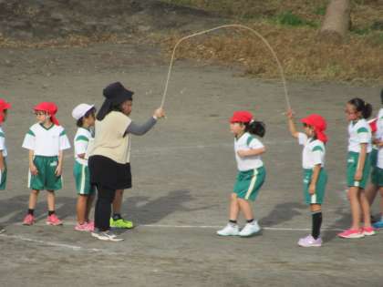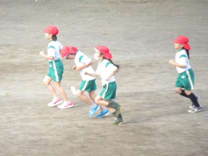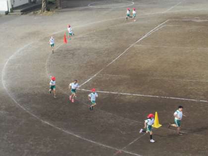 駆け足記録会の練習をしています。記録をとったら、今度は長縄の記録に挑戦します。