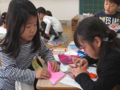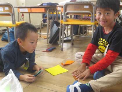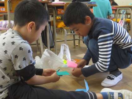 今日は、おりがみ生き物ランドの第2時でした。友達と教え合いながら、いろいろなおりがみを楽しみました。