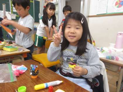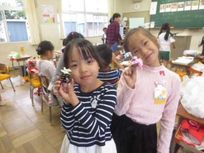 今日は、秋の物を使い、おもちゃやかざりを作って遊びました。