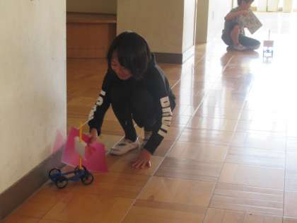 風の力を調べています。車を走らせると、帆が風を受けて押されていることを実感できました。