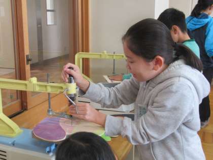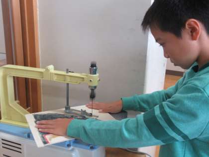板材を使って、仮面を作っています。電動糸鋸も使って、制作しています。