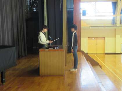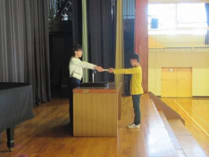 読書感想文と、夏休みの研究作品展の入賞者が、全校の仲間から拍手をもらいました。